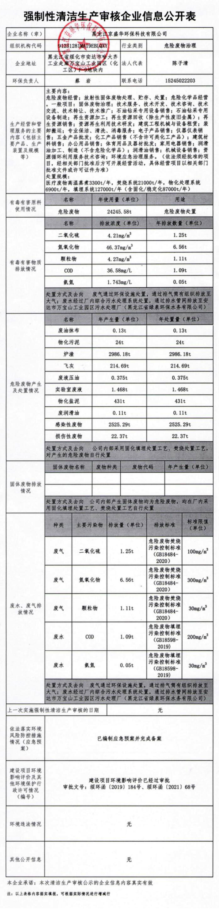 黑龍江京盛華環保科技有限公司固體廢物污染環境防治信息公示