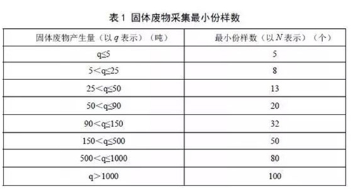 4.2.2固體廢物為歷史**固體廢物時(shí),若采集可類比工藝產(chǎn)生的固體廢物,則依據(jù)可類比工藝的固體廢物產(chǎn)生量按照表1確定需要采集的最小份樣數(shù);若采集歷史**固體廢物,應(yīng)以**的固體廢物總量為依據(jù),按照表1確定需要采集的最小份樣數(shù)。